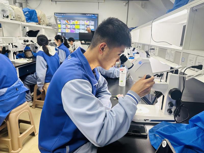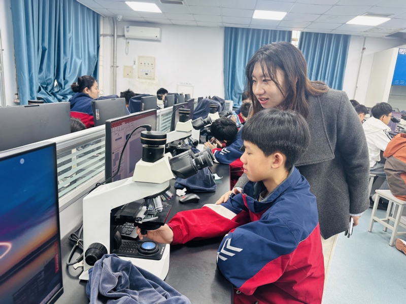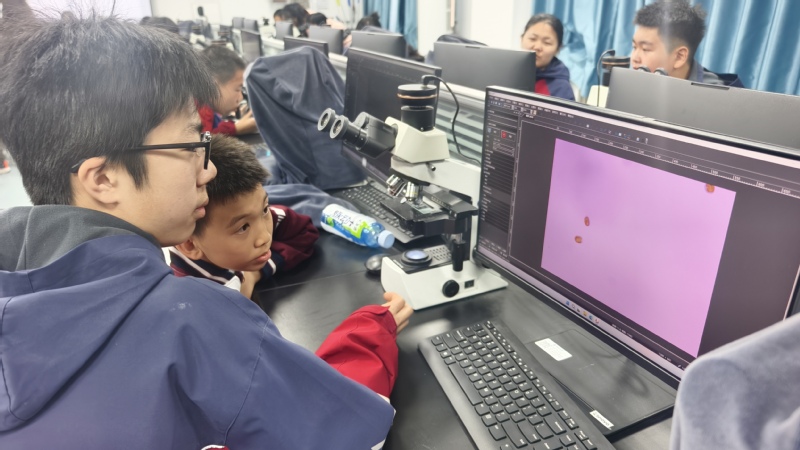 在随后的实验环节,曹蕾老师与海大的在读研究生们手把手指导同学们操作高倍显微镜。当视野中清晰地呈现出藻类植物精致的硅质壳体与游动轨迹时,同学们惊叹不已,仿佛瞬间穿越到了奇妙的微观海洋世界。
