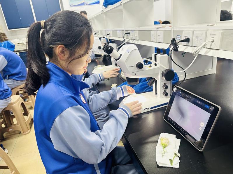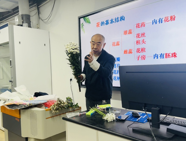 与此同时,同学们也在薛虓嵩主任的指导下,回顾了课本中关于“花的结构”的知识,并利用体视显微镜对小花葱、松红梅、蓝星花和洋桔梗等植物花的结构进行了细致的解剖观察。